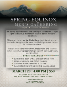 Join Alicia Garza for a day of balance, incorporating intentional movement, breath work, seasonal herbal support and guided meditation to strengthen the spine, and prepare for spring with clarity, strength & direction.