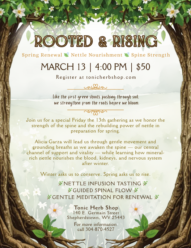 Join us for a special gathering as we honor the strength of the spine and the rebuilding power of nettle in preparation for spring.